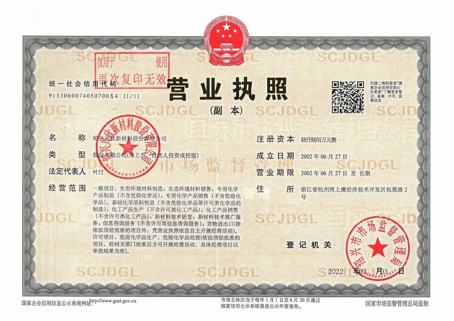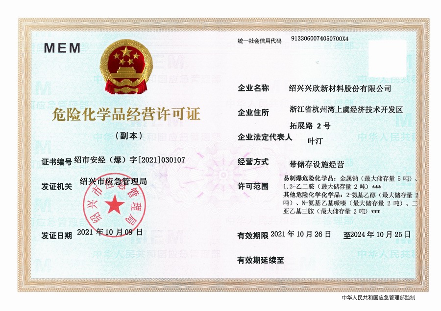 Shaoxing Xingxin New Materials Co., Ltd. was established in June 27, 2002, with an area of 81,374 square meters. Now, we are located at No.2 Tuozhan road of Hangzhou Bay Shangyu Economic and Technological Development Zone, with more than 200 employees (over 50 technicians) and a knowledge-based and professional technical research team composed of more than 30 doctoral and master students. Aiming for the global market, our company is a province-level technological enterprise specializing in the development of electronic chemicals, environment-friendly chemicals, pharmaceutical intermediates, high molecule materials and other advanced new materials. At present, we have two production bases such as Zhejiang Shangyu and Anhui Dongzhi.